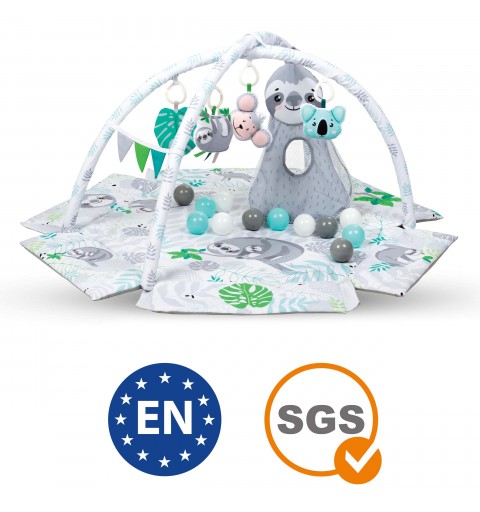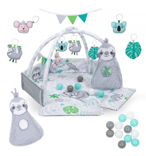 W zestawie: Instrukcja w języku polskim, angielskim i niemieckim, 5 zabawek, materiałowa girlanda, worek z 12 piłeczkami, mata z pałąkami