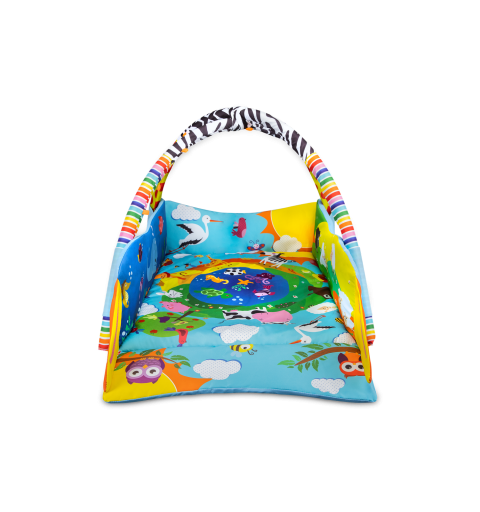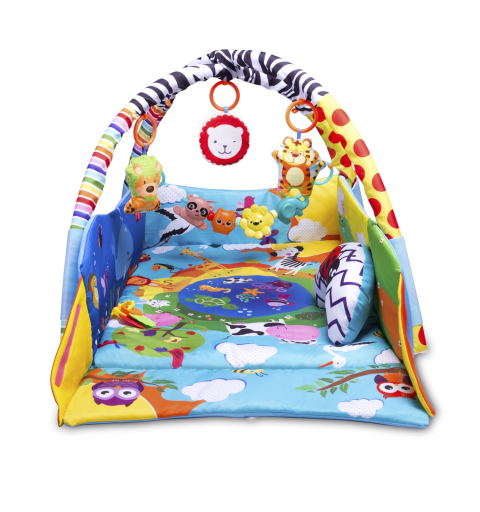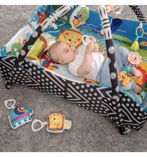 Bogaty zestaw interaktywnych zabawek o różnych kształtach i kolorach można zawiesić na pałąkach, dzięki czemu dziecko rozwija zdolności motoryczne i manualne. Dodatkowo dołączony jest gryzaczek w formie gumowych zawieszek na.
