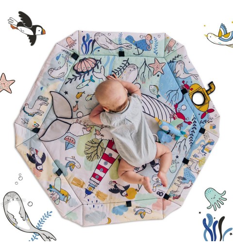 Stonowane kolory i piękny wzór morski sprawiają, że maluch wyciszy się podczas zabawy. Dodatkowo mata będzie poruszać wyobraźnię dziecka - morskie, zabawne stworki zachęcają dziecko do dotykania, a rodziców: do opowiadania o podwodnym świecie.