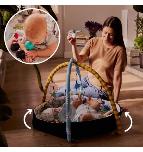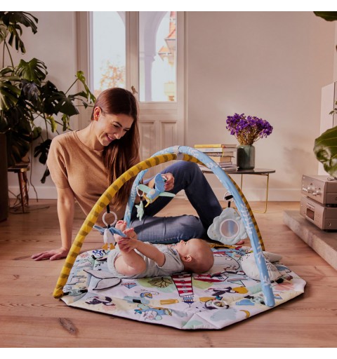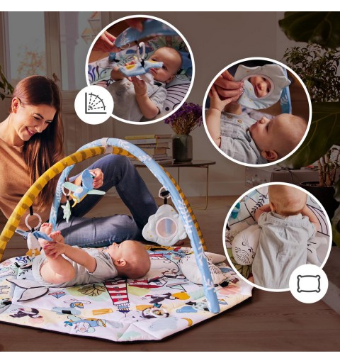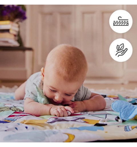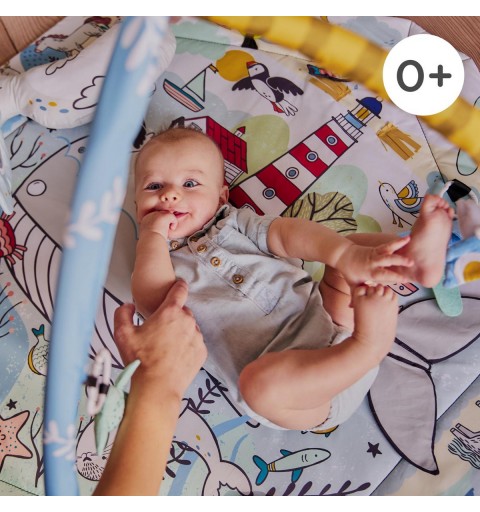 Do maty dołączono 5 odczepianych zabawek: piszczącą mewę, samolot z grzechotką, rozgwiazdę z grzechotką, rybkę z szeleszczącymi tasiemkami i lusterko w kształcie chmury. Można je dowolnie przepinać na regulowanym pałąku - dziecko będzie wyciągać do nich rączki, ćwicząc wzrok oraz chwyt. Regulowane pałąki łatwo dostosujesz do wieku i zdolności motorycznych malca. Do maty dołączona jest miękka poduszka, która wspiera naukę leżenia na brzuszku.