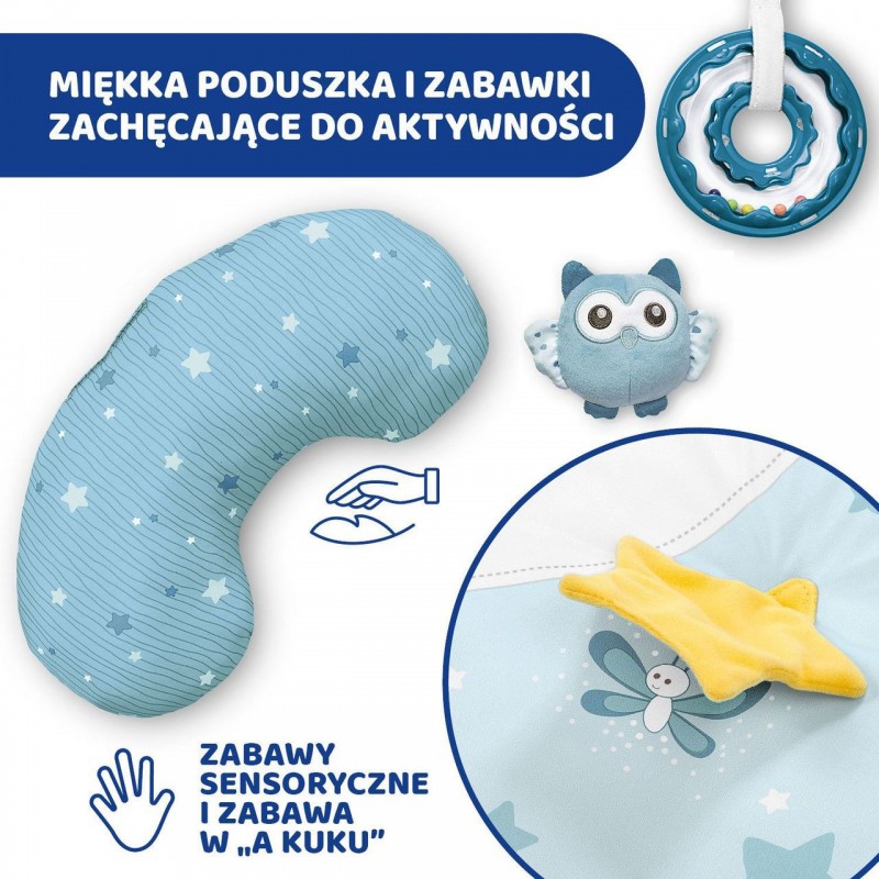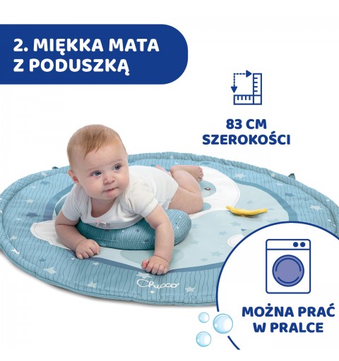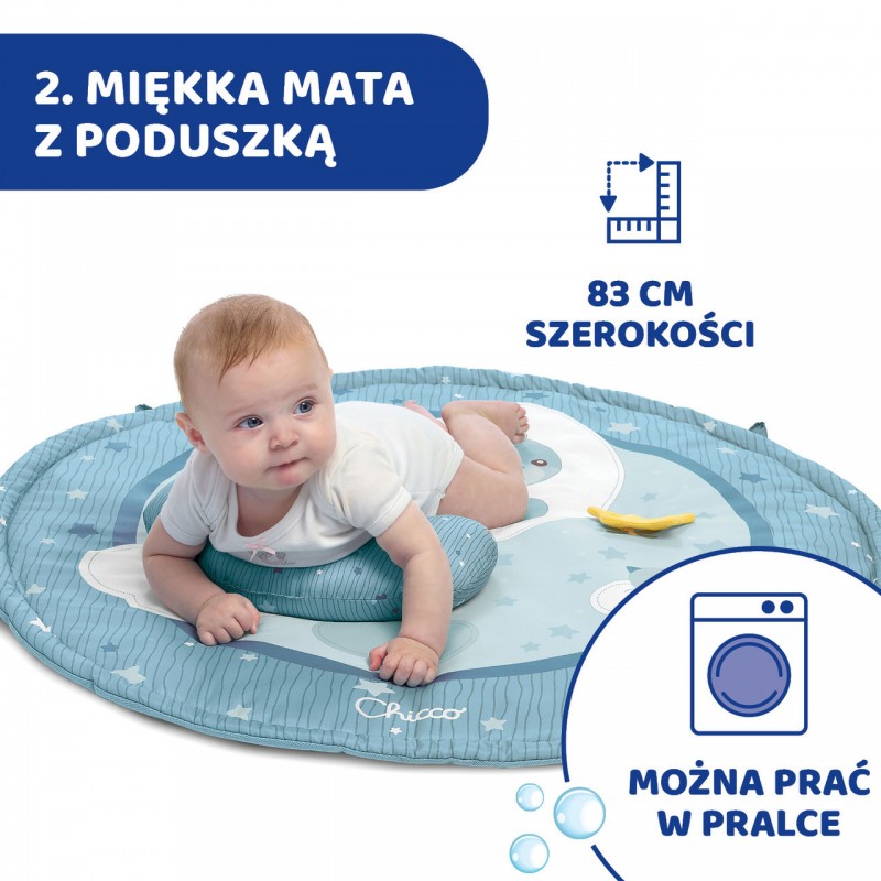 Okrągła mata o średnicy 83 cm z poduszką do podparcia – do zabawy w pozycji na brzuchu;