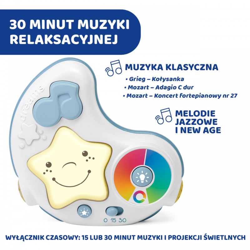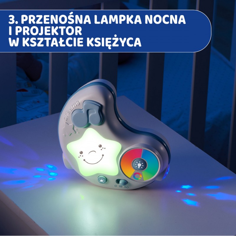 Przenośna lampka nocna z projektorem wyposażona jest w wyłącznik czasowy 15 lub 30 minut oraz 3 tryby projekcji i melodii: