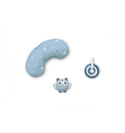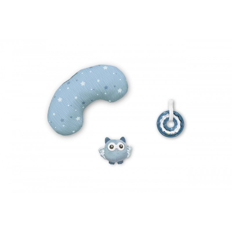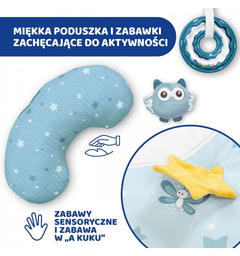 Mata jest uzupełniona w poduszkę, zabawki i grzechotki (2 zabawki wiszące, 2 grzechotki: z tworzywa i z materiału). Zabawki można również odpiąć.