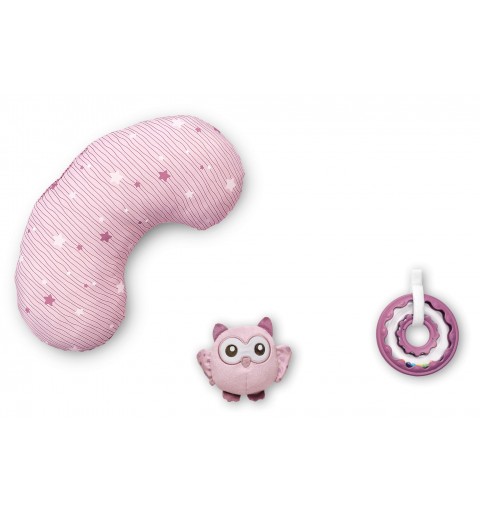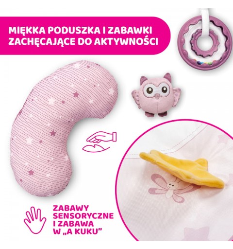 Mata jest uzupełniona w poduszkę, zabawki i grzechotki (2 zabawki wiszące, 2 grzechotki: z tworzywa i z materiału). Zabawki można również odpiąć.