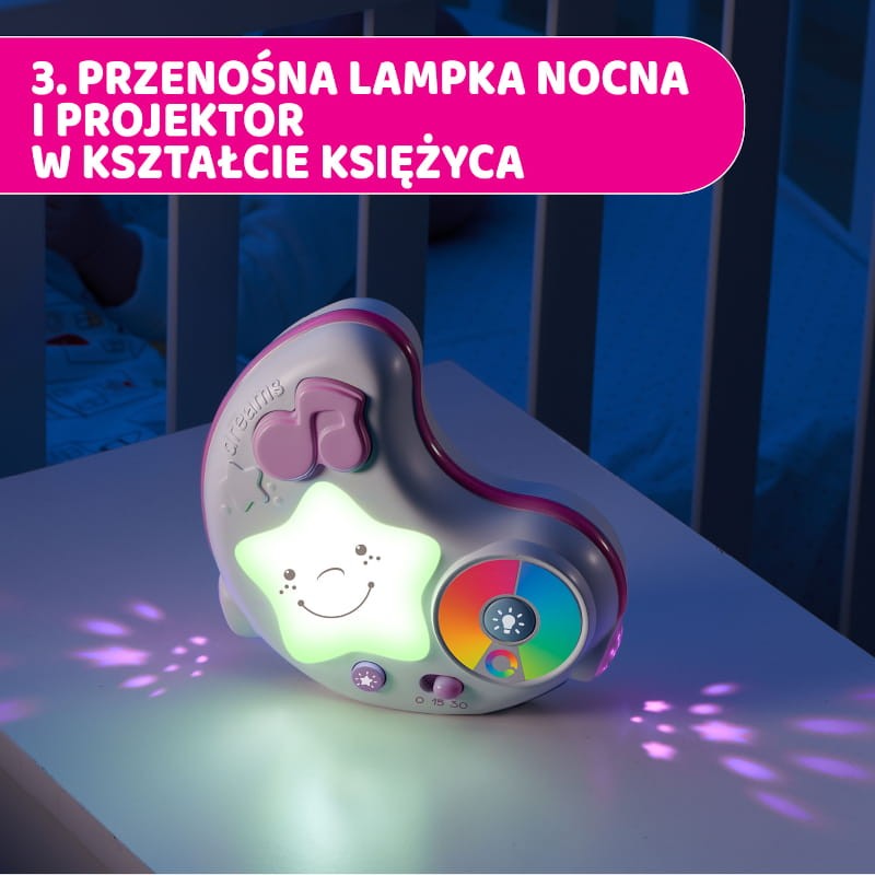 Projektor to doskonałe urządzenie dla rodziców, którzy pragną oświetlić dziecięcy pokój delikatnym światłem sprzyjającym stworzeniu spokojnej atmosfery przed zaśnięciem maluszka. Emitowane światło tworząc efekt koloroterapii, sprawi, że dziecko będzie czuło się zrelaksowane i bezpieczne w swoim pokoiku, a spokojne melodie odtwarzane przez urządzenie ukołyszą je do snu.