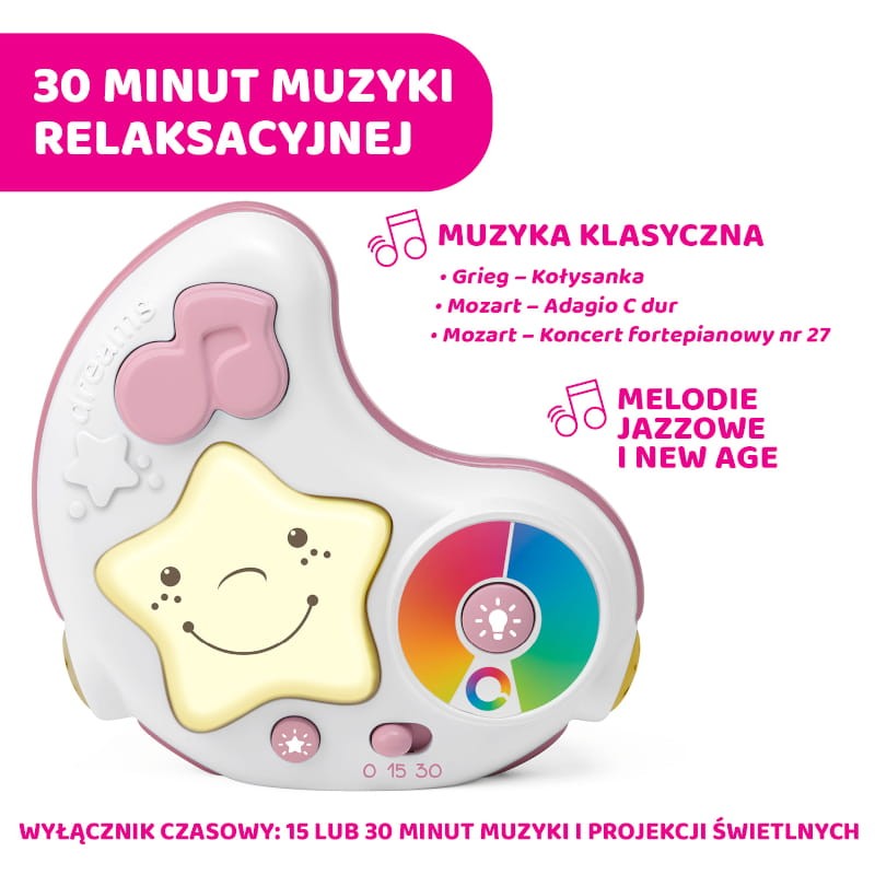 Przenośna lampka nocna z projektorem wyposażona jest w wyłącznik czasowy 15 lub 30 minut oraz 3 tryby projekcji i melodii: