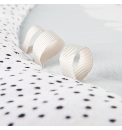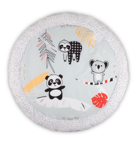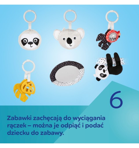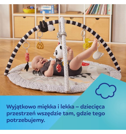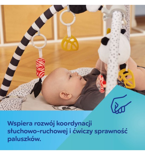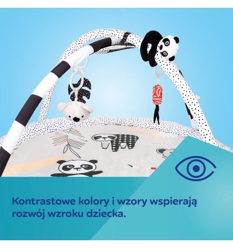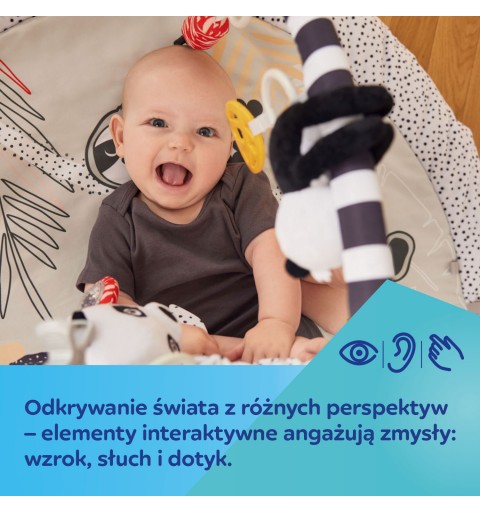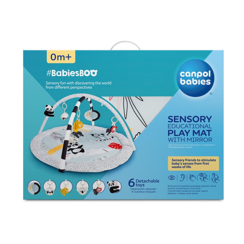 Sensoryczna mata edukacyjna Canpol babies pozwala odkrywać dziecku świat z różnych perspektyw. Różne tekstury materiałów, kontrastowe kolory i łagodne dźwięki to świetna rozrywka dla rozwijających się zmysłów maluszka już od pierwszych chwil życia. Mata edukacyjna z 6 zabawkami, które zachęcają dziecko do aktywności i wyciągania do nich rączek, pomaga rozwijać sprawność ruchową, wzmacnia mięśnie i ćwiczy zdolności manualne. Zabawki są zawieszone na pałąkach, które można łatwo zdemontować, aby wyprać matę lub zabrać ze sobą wszędzie tam, gdzie chcemy stworzyć dziecięcą przestrzeń, zapewniając bezpieczny i czysty kawałek podłogi. Zabawki można odpinać i podać do zabawy: 2 grzechoczące buzie zwierzątek, 2 szeleszczące listki z lusterkiem otoczonym kolorowymi metkami i grzechotką oraz z gryzakiem, który przyniesie ulgę podczas ząbkowania, duże odpinane lusterko, które można przypiąć w dowolnym miejscu i gdy Maluch podrośnie będzie zachęcało do leżenia na brzuszku oraz panda z piszczkiem i łapkami na rzepy, dzięki którym można połączyć je ze sobą i objąć nimi pałąk maty lub szczebelek dziecięcego łóżeczka. Wszystkie te interaktywne elementy wspierają rodzica w treningu sensorycznym dziecka, który pozytywnie wpływa na jego rozwój emocjonalny i poznawczy. Mata edukacyjna sensoryczna Canpol babies zachęca dziecko do gimnastyki i chwytania wiszących zabawek, wspomagając rozwój zmysłów poprzez zabawę – wzroku, słuchu i dotyku oraz umiejętności manualnych i motorycznych. Leżenie na macie edukacyjnej pozwala dziecku dostrzec pewne prawidłowości, np. że machając rączką i dotykając wiszących zabawek, powoduje ich ruch i bujanie. Podczas leżenia na brzuszku dziecko może eksplorować za każdym razem inne części maty, które wzbudzają zainteresowanie wyraźnymi kontrastowymi kolorami i wzorami, metkami czy przepiętymi zabawkami w inne miejsce niż zazwyczaj. W późniejszym etapie rozwoju, sensoryczna mata edukacyjna dla niemowlaka, zachęca dziecko do ruszenia z miejsca – pełzania, a później do raczkowania. Sensoryczna mata edukacyjna Canpol babies pomoże zadbać o odpowiednią motorykę każdego Maluszka! Mata edukacyjna sensoryczna Canpol babies to bezpieczny i wspaniały sposób na zajęcia dziecka, a rodzicowi pozwoli na chwilę dla siebie lub na domowe obowiązki.