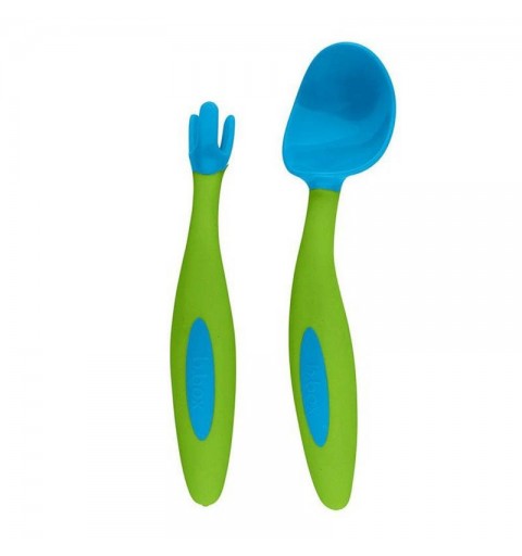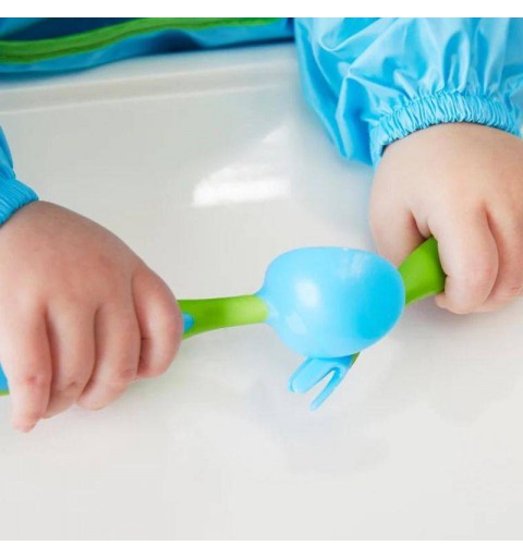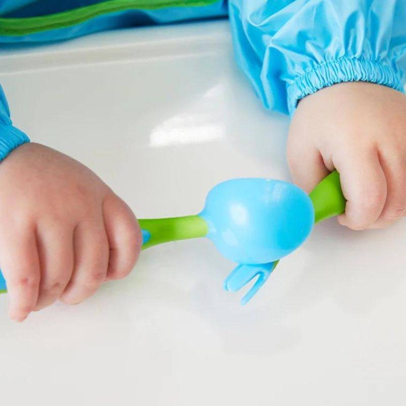 łyżeczka i opatentowany widelec dopasowane wielkością i kształtem do umiejętności i możliwości najmłodszych, zamknięte w praktycznym futerale;