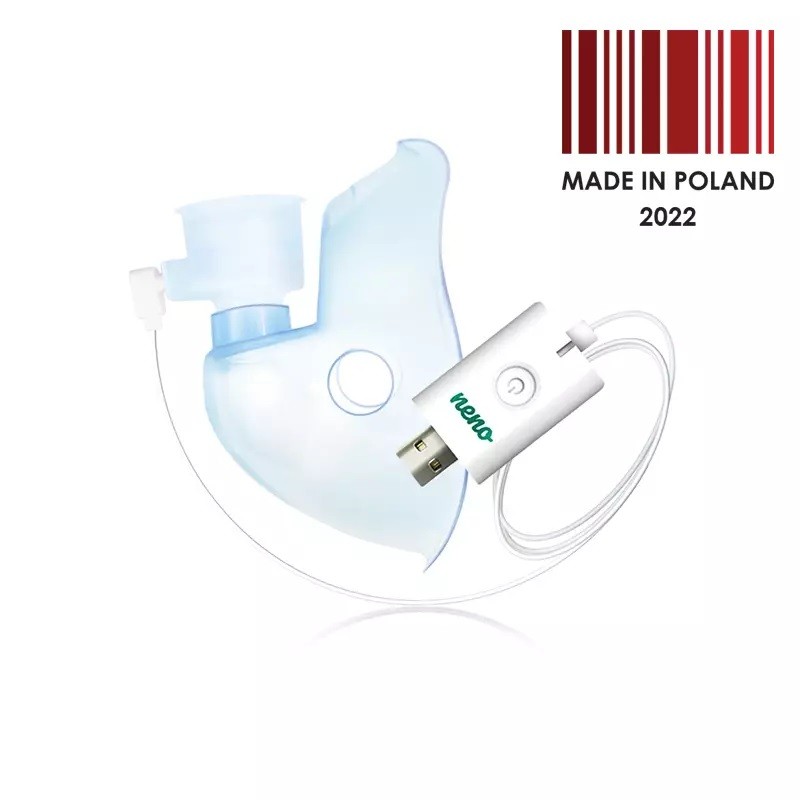 Nebulizator Neno Bene to urządzenie wielokrotnego użytku, składające się z niewielkiego pojemniczka na lek, silikonowej maski i przewodu zasilającego z końcówką USB, którą można podpiąć do laptopa. Dzięki temu możesz mieć go przy sobie w pracy i zastosować, gdy przyjdzie taka potrzeba. Wystarczy swobodnie oddychać. Prosta konstrukcja sprawia, że ręce masz zawsze wolne, więc możesz nie odrywać się od pracy podczas inhalacji.