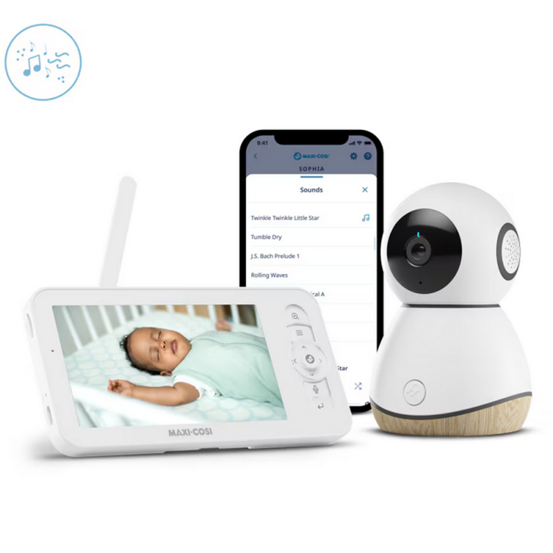 W aplikacji lub na ekranie rodzica można ustawić własne zaawansowane programy i zdalnie sterować obrotem, pochyleniem i powiększeniem, a także wybrać kojący dźwięk oraz regulować poziomy temperatury i wilgotności.