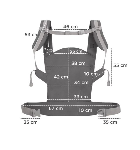 szerokość pasa biodrowego z przodu: 10 cm ; długość pasa biodrowego, część materiałowa: 67 cm ; maksymalnie wyregulowany pas o długości 70 cm,