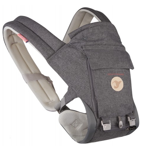 płaszczyzna siodełka biodrowego wykonana jest ze specjalnej gumowanej antypoślizgowej tkaniny. Dodatkowo pozycja siodełka jest tak wyprofilowana, żeby zawsze było skierowane lekko ku górze zapewniając większą wygodę (przy prawidłowym zapięciu nosidełka i pasa biodrowego)