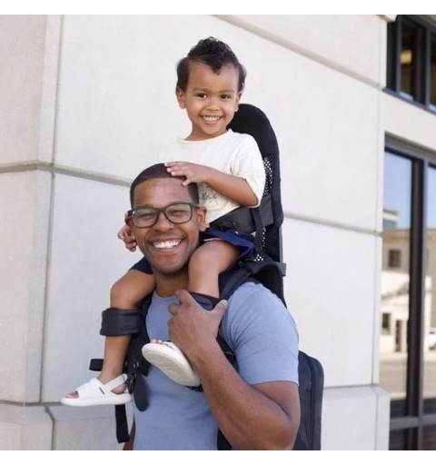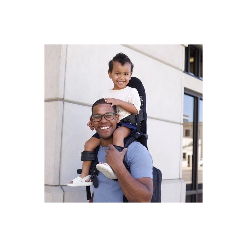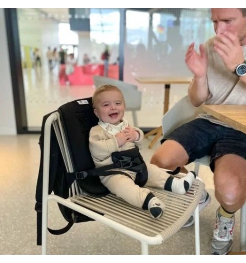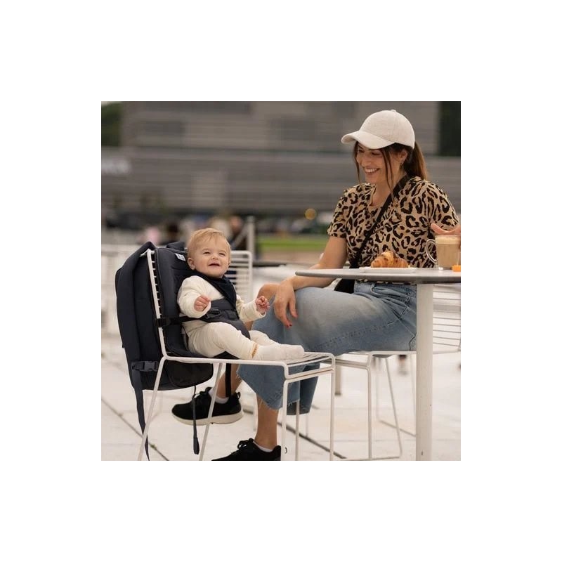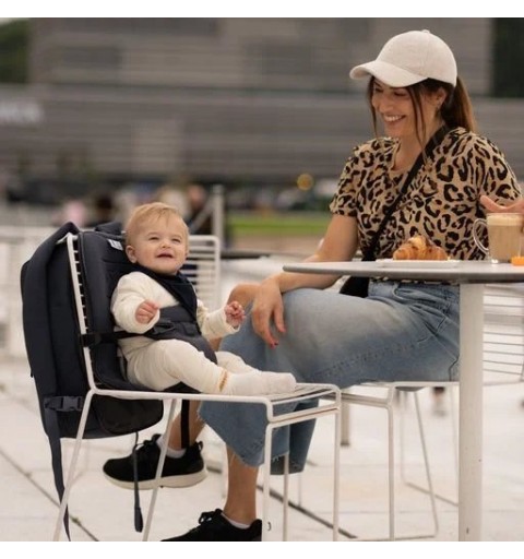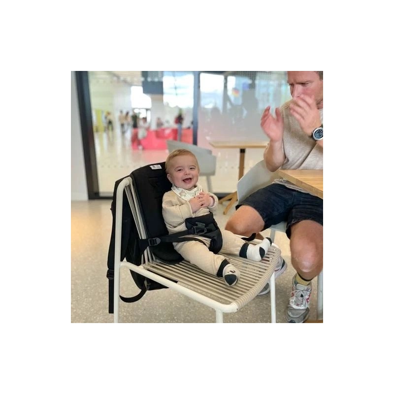 Otwórz tylną klapę plecaka, wywiń na zewnątrz siodełko, zapnij boczne paski, aby ławka w parku, krzesło przy kawiarnianym stoliku i inne miejsca zamienić w wygodne siedzisko dla dziecka.