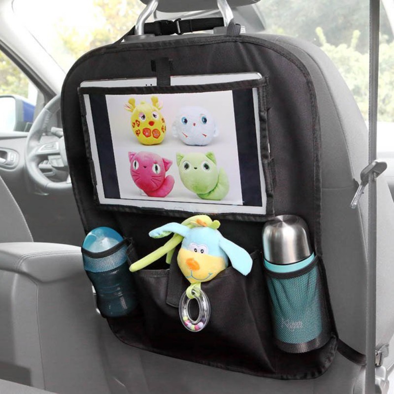 Organizer do samochodu z miejscem na tablet to idealne rozwiązanie na każdą podróż! Organizer wyposażony jest w łatwe w obsłudze kalmry, dzięki którym zamieścisz go na przednim siedzeniu przed dzieckiem. Na górze organizera znajduje się specjalna kieszeń na tablet, na którym dziecko może oglądać podczas podróży swoją ulubioną bajkę! Oprócz miejsca na tablet organizer wyposażony jest w trzy dodatkowe kieszenie. Dwie siateczkowe kieszenie pomieszczą niezbędne akcesoria Maluszka takie jak termos na picie, butelkę, czy kubeczek. Dodatkowo zapinana na rzep pojemna kieszeń, która pomieści wszystkie zabawki czy potrzebne w podróży gadżety dziecka. Oprócz miejsca na tablet, pojemnych kieszeni i miejsca do przechowywania w samochodzie, organizer stanowi także zabezpieczenie fotela przed brudnymi bucikami dziecka.