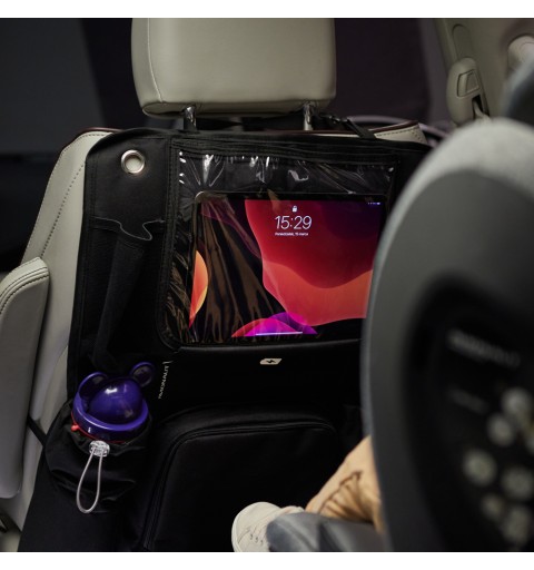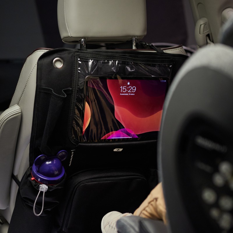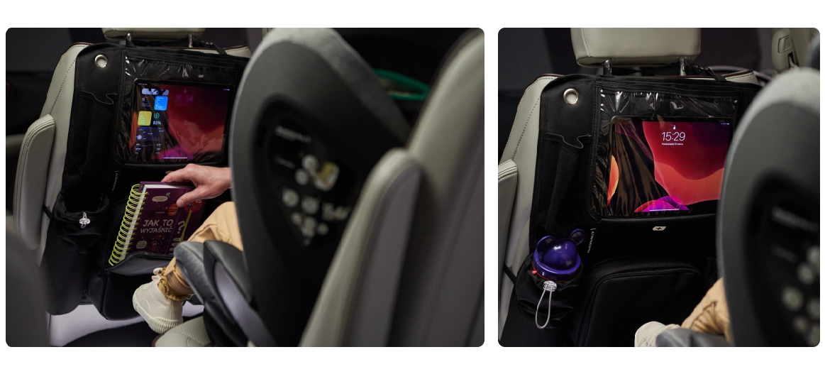 Organizer dla dzieci do samochodu posiada miejsce na tablet oraz powerbank. Dzięki temu długie podróże będą przyjemniejsze.
