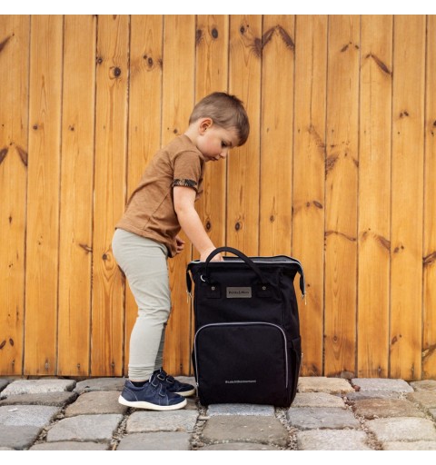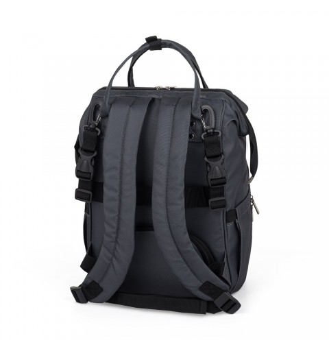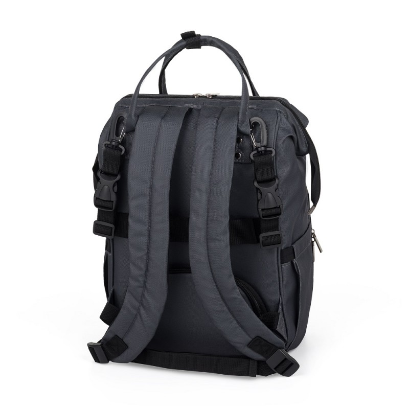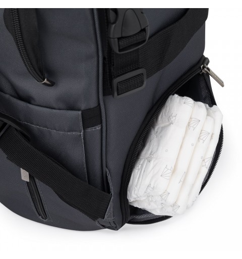 Ten wygodny i organizacyjnie przemyślany plecak wykonany jest z wysokiej jakości materiałów, odpornych na działanie wilgoci. Posiada boczne paski do mocowania na wózku, a główna komora zapinana jest na dwusuwakowy zamek. Duża ilość kieszeni, w tym funkcyjne a także łatwy dostęp do zawartości dzięki bocznemu otworowi sprawią, że pakowanie się w podróż czy na spacer stanie się o wiele łatwiejsze. Plecak posiada termo-kieszeń, kieszonkę na wilgotne rzeczy, kieszenie przeznaczone na butelki oraz smycz na klucze. W zestawie znajduje się mata do przewijania. Waga plecaka bez produktów w środku nie przekracza kilograma.