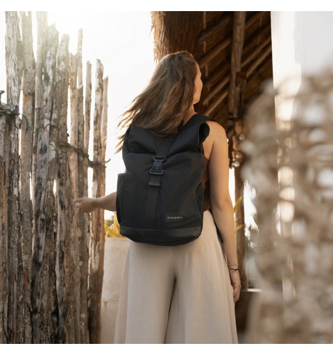 Ten wygodny i organizacyjnie przemyślany plecak wykonany jest z wysokiej jakości materiałów, odpornych na działanie wilgoci. Posiada boczne paski do mocowania na wózku, a główna komora zapinana jest na zamek przebiegający przez górę i bok plecaka. Dzięki temu plecak otwiera się bardzo szeroko i można dokładnie przejrzeć jego zawartość i wygodnie sięgnąć po rzecz, nawet głęboko schowaną. Dodatkowo góra plecaka ma zapięcie typu rolltop zamykane na magnetyczną klamrę, łączącą zalety tradycyjnych mechanizmów zamykających z nowoczesną technologią magnetyczną. Klamra opatentowana przez firmę FidlOck, działa na zasadzie przyciągania magnesów, co sprawia, że jej obsługa jest niezwykle intuicyjna i szybka. Otwiera się po prostu poprzez pociągnięcie zawieszki zamocowanej do klapki ze stali nierdzewnej. Proste i bezpieczne rozwiązanie pozwala na szybki dostęp do zawartości plecaka bez konieczności użycia siły. Aby zamknąć klamrę, wystarczy zbliżyć do siebie obie części. Silne magnesy automatycznie zepną klamrę, zapewniając solidne i pewne zamknięcie. Mocne magnesy nie tylko ułatwiają zamykanie, ale także zabezpieczają zawartość plecaka przed przypadkowym otwarciem, co jest szczególnie ważne podczas dynamicznych ruchów lub w trakcie noszenia plecaka na plecach.