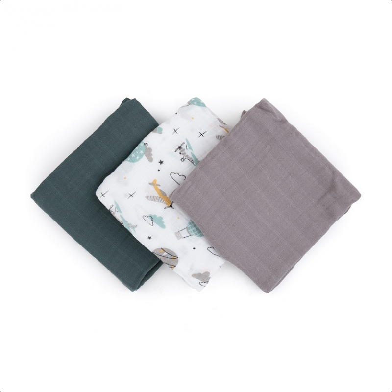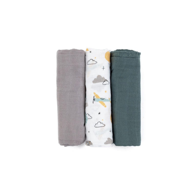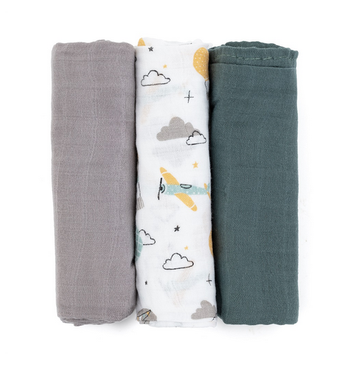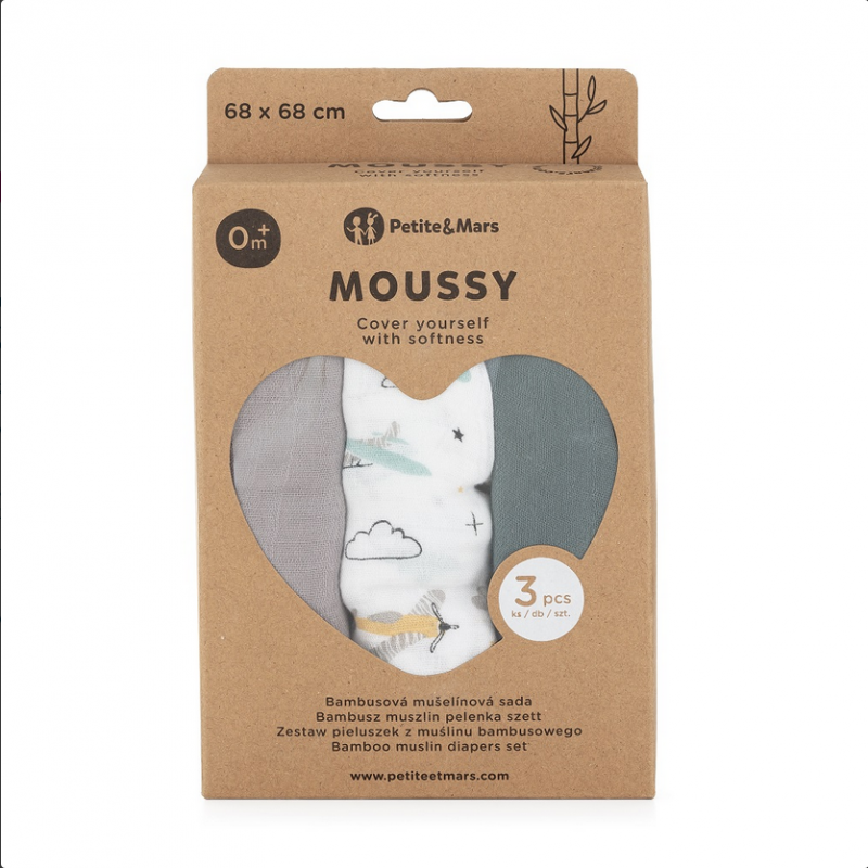 Petite&Mars Moussy - 3 pieluchy bambusowe 68x68 | Grey Planes
