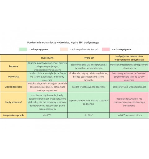 Zasypianie bez pieluszki to wyzwaie dla najskuteczniejszego ochraniacza. Zdecydowanie taką ochronę zapewni ochraniacz Hydro 3D. Wszystko dzięki wodoodpornemu laminatowi, który zapewnia gwarancję nieprzepuszczalności nawet przy dużej ilości cieczy. Wierzchnia część ochraniacza to siatka 3D, która tuż przy skórze maluszka dba o jej odpowiednią wentylację. Dzięki temu ochraniacz Hydro 3D można stosować codziennie w odróżnieniu od zwykłych ochraniaczy.