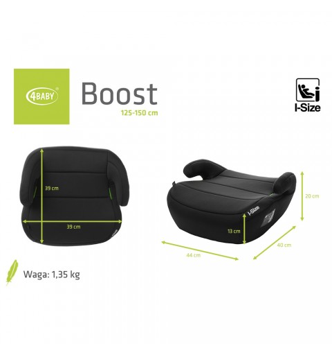 Fotelik Boost i-Size stworzony jest z myślą o starszych dzieciach o wzroście 125-150 cm . Został wykonany i przetestowany zgodnie z najbardziej restrykcyjną homologacją R129 . Podwyższone podłokietniki zapewniają optymalne prowadzenie pasa, a skorupa z tworzywa sztucznego jest sprawdzona pod kątem największych obciążeń. Boost montowany jest za pomocą 3-punktowych pasów samochodowych, dzięki czemu pasuje do samochodów bez systemu isofix.