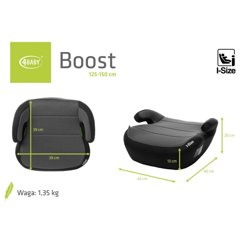 Fotelik Boost i-Size stworzony jest z myślą o starszych dzieciach o wzroście 125-150 cm . Został wykonany i przetestowany zgodnie z najbardziej restrykcyjną homologacją R129 . Podwyższone podłokietniki zapewniają optymalne prowadzenie pasa, a skorupa z tworzywa sztucznego jest sprawdzona pod kątem największych obciążeń. Boost montowany jest za pomocą 3-punktowych pasów samochodowych, dzięki czemu pasuje do samochodów bez systemu isofix.