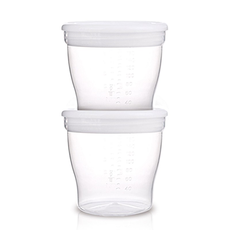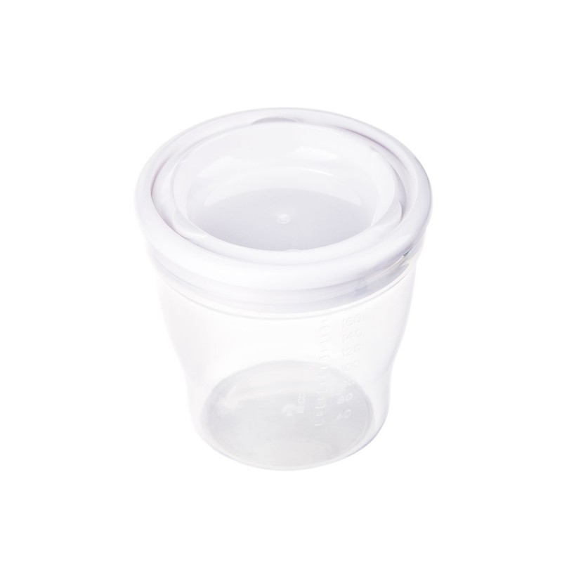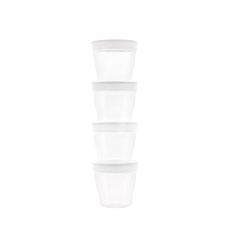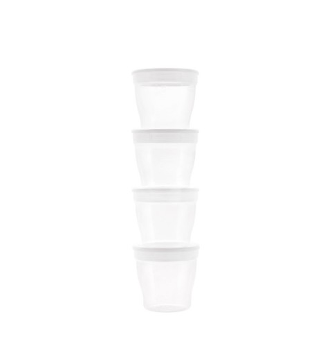 Praktyczne pojemniki umożliwiają długotrwałe przechowywanie pokarmu utrzymując jego wysoką jakość. Posiadają szczelne pokrywki, dzięki czemu nic się z nich nie wylewa nawet gdy pojemnik jest przechylony. Można je ustawić jeden na drugim. Posiadają czytelną skalę. Pokrywka może także pełnić funkcję podstawki - dla lepszej stablizacji przy przelewaniu płynu. Wykonane zostały z materiału przeznaczonego do kontaktu z żywnością. W opakowaniu 4 pojemniki z pokrywkami o pojemności 180ml.
