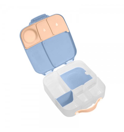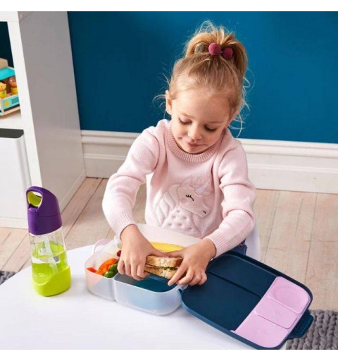 Duży lunchbox b.box jest produktem funkcjonalnym i wygodnym w użytkowaniu. Do przenoszenia służy poręczny uchwyt. Klips zamykający dobrze trzyma a jednocześnie z łatwością daje się otworzyć nawet przedszkolakom. Także mycie nie nastręcza kłopotów. Nie ma tu trudno dostępnych zakamarków, ruchome przegrody są wyjmowane a silikonowa uszczelka na pokrywce zdejmowana. Dzięki temu szybko i dokładnie umyjesz i osuszysz lunchbox. Pudełko z jedzeniem możesz także schować do lodówki.