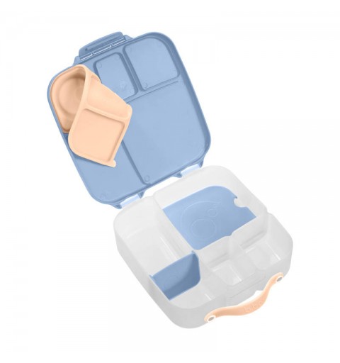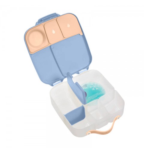 Pudełko śniadaniowe z poręcznym uchwytem skrywa w sobie małe i duże przegrody, dzięki którym zapakujesz dziecku do szkoły lub na wycieczkę jego ulubione potrawy i przekąski. Lunchbox b.box ma kilka sprytnych rozwiązań. Ruchome przegrody, które można przestawiać lub wyjąć by zmieścić w pudełku całego banana lub jabłko. Dużą kwadratową przegrodę w sam raz na apetyczny makaron z warzywami lub kanapki. Ta przegroda ma praktyczny "patent". Podwójne dno, pod które możesz schować dołączony do zestawu wkład chłodzący. Dzięki niemu produkt w przegrodzie dłużej pozostanie chłodny i świeży. Rozwiązanie idealne szczególnie gdy za oknem słońce i wysokie temperatury. Silikonowa uszczelka przykrywająca mniejsze przegródki umożliwi przenoszenie w nich miękkich soczystych owoców, jogurtu lub dipu do warzyw. Jednym słowem, przygotowując dziecku drugie śniadanie, lunch czy prowiant na wycieczkę nie musisz rezygnować z różnorodności i właściwego zbilansowania posiłku.