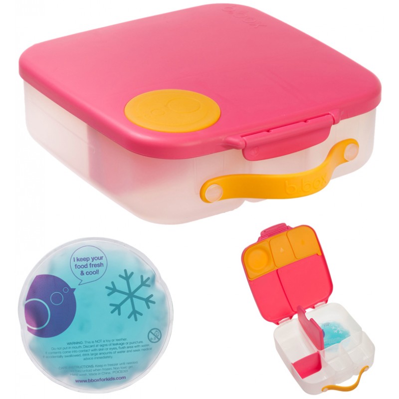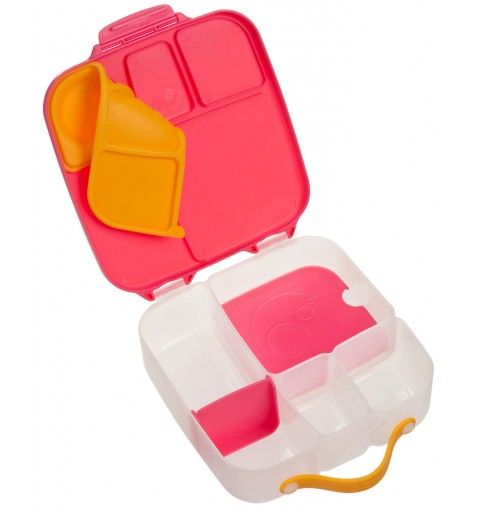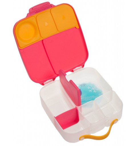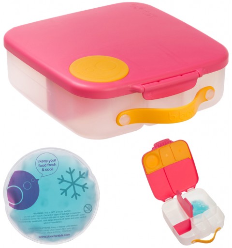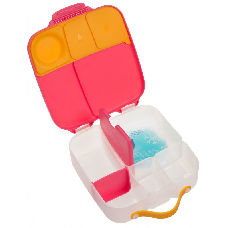 Pudełko śniadaniowe z poręcznym uchwytem skrywa w sobie małe i duże przegrody, dzięki którym zapakujesz dziecku do szkoły lub na wycieczkę jego ulubione potrawy i przekąski. Lunchbox b.box ma kilka sprytnych rozwiązań. Ruchome przegrody, które można przestawiać lub wyjąć by zmieścić w pudełku całego banana lub jabłko. Dużą kwadratową przegrodę w sam raz na apetyczny makaron z warzywami lub kanapki. Ta przegroda ma praktyczny "patent". Podwójne dno, pod które możesz schować dołączony do zestawu wkład chłodzący. Dzięki niemu produkt w przegrodzie dłużej pozostanie chłodny i świeży. Rozwiązanie idealne szczególnie gdy za oknem słońce i wysokie temperatury. Silikonowa uszczelka przykrywająca mniejsze przegródki umożliwi przenoszenie w nich miękkich soczystych owoców, jogurtu lub dipu do warzyw. Jednym słowem, przygotowując dziecku drugie śniadanie, lunch czy prowiant na wycieczkę nie musisz rezygnować z różnorodności i właściwego zbilansowania posiłku.