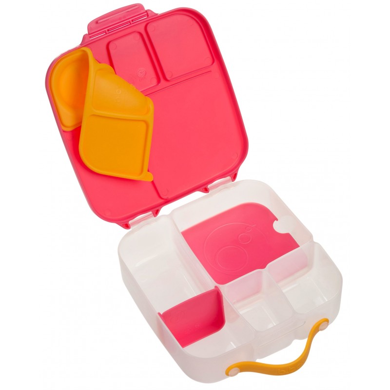 Duży lunchbox b.box jest produktem funkcjonalnym i wygodnym w użytkowaniu. Do przenoszenia służy poręczny uchwyt. Klips zamykający dobrze trzyma a jednocześnie z łatwością daje się otworzyć nawet przedszkolakom. Także mycie nie nastręcza kłopotów. Nie ma tu trudno dostępnych zakamarków, ruchome przegrody są wyjmowane a silikonowa uszczelka na pokrywce zdejmowana. Dzięki temu szybko i dokładnie umyjesz i osuszysz lunchbox. Pudełko z jedzeniem możesz także schować do lodówki.