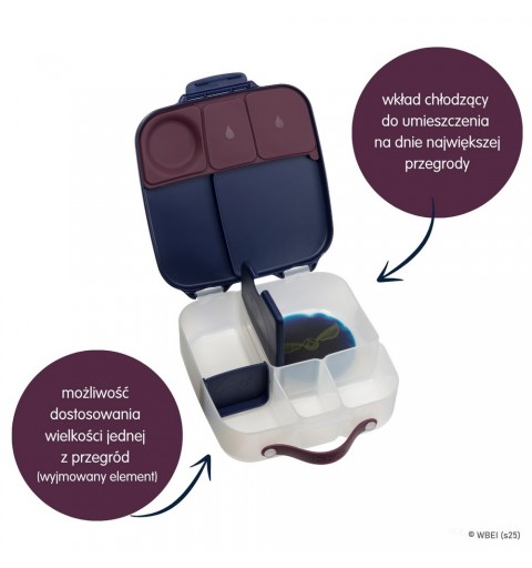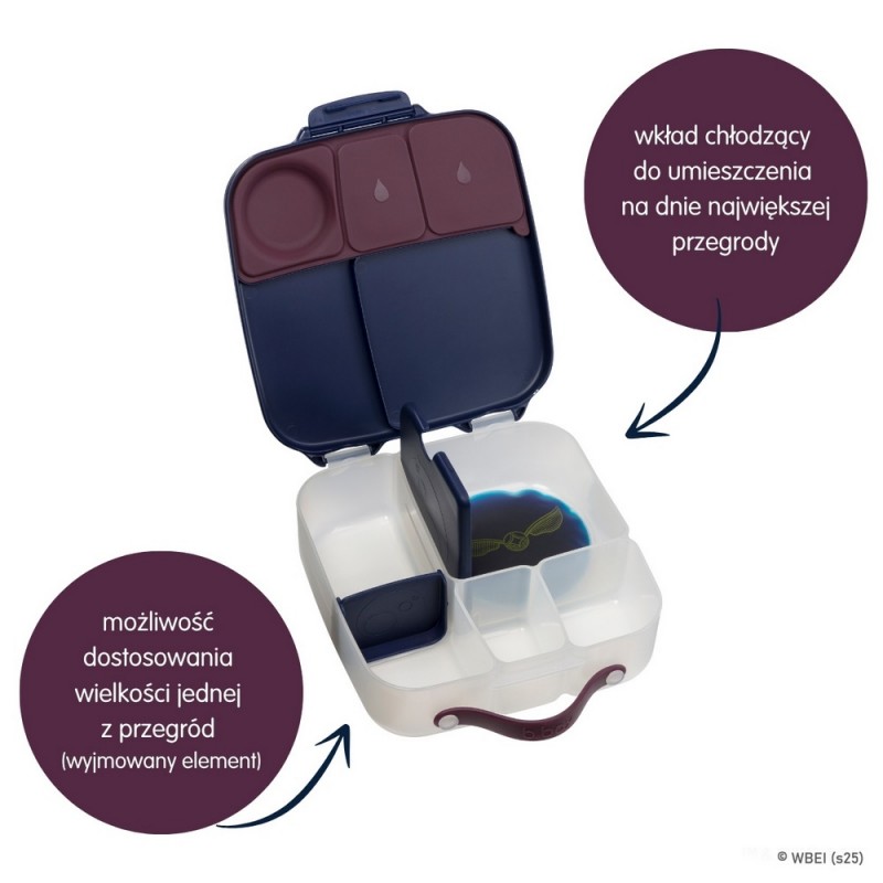 Pudełko śniadaniowe z poręcznym uchwytem skrywa w sobie małe i duże przegrody, dzięki którym zapakujesz dziecku do szkoły lub na wycieczkę jego ulubione potrawy i przekąski. Lunchbox b.box ma kilka sprytnych rozwiązań. Ruchome przegrody, które można przestawiać lub wyjąć by zmieścić w pudełku całego banana lub jabłko. Dużą kwadratową przegrodę w sam raz na apetyczny makaron z warzywami lub kanapki. Ta przegroda ma praktyczny "patent". Podwójne dno, pod które możesz schować dołączony do zestawu wkład chłodzący. Dzięki niemu produkt w przegrodzie dłużej pozostanie chłodny i świeży. Rozwiązanie idealne szczególnie gdy za oknem słońce i wysokie temperatury. Silikonowa uszczelka przykrywająca mniejsze przegródki umożliwi przenoszenie w nich miękkich soczystych owoców, jogurtu lub dipu do warzyw. Jednym słowem, przygotowując dziecku drugie śniadanie, lunch czy prowiant na wycieczkę nie musisz rezygnować z różnorodności i właściwego zbilansowania posiłku.
