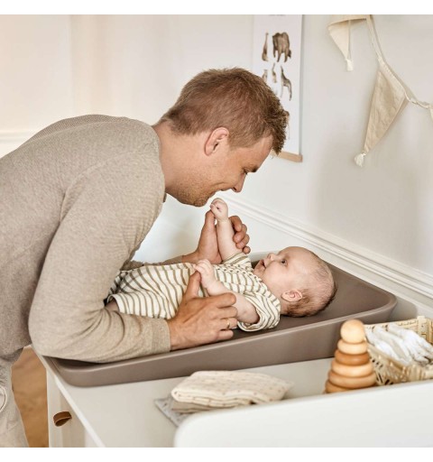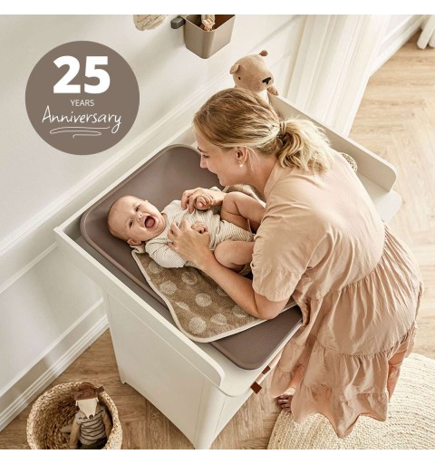 Przewijak Leander Matty™ jest lekki i ma mocną konstrukcję gwarantującą lepszą stabilność, dzięki czemu możesz go zabrać ze sobą i postawić w dowolnym miejscu, na przykład na komodzie, stole lub na podłodze. Małe gumowe nóżki zapewniają wentylację, zapobiegają zawilgoceniu i pozostawieniu śladów na powierzchni pod przewijakiem. Przewijak Matty™ został poddany testom i uzyskał certyfikaty zgodności z europejską normą dotyczącą bezpieczeństwa dzieci i niebezpiecznych substancji.