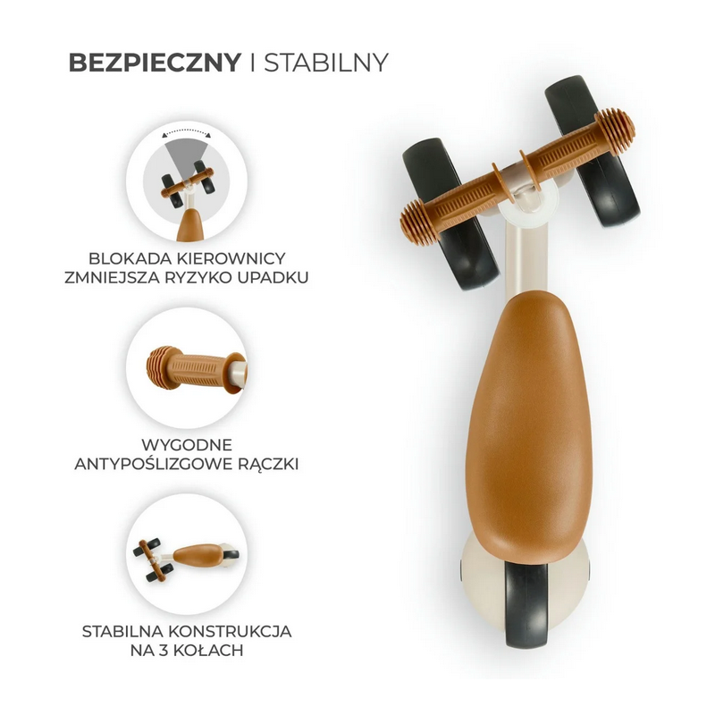Dzięki temu, że tylne koło ma łożyska, konstrukcja jeździka jest jeszcze bardziej wytrzymała, a jazda płynna i przyjemna.