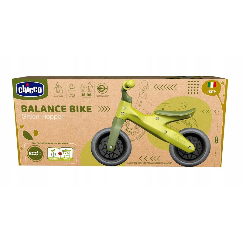 Rowerek biegowy ECO+ Chicco to pierwszy rowerek biegowy wykonany z plastiku z recyklingu o współczesnym designie inspirowanym naturą. Jest niezwykle przydatny dziecku w ćwiczeniu równowagi i dostarcza maluchowi dreszczyku emocji podczas jazdy pierwszym rowerem.Rowerek biegowy ECO+ posiada ewolucyjne siodełko i wygodne uchwyty, które podążają za rozwojem dzieci w wieku od 18 miesięcy do 3 lat.