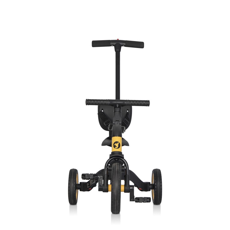 Rowerek trójkołowy – dla dzieci w wieku od 2 do 3 lat. W tej konfiguracji rowerek ma zamontowane pedały i rozstawione tylne koła. Oparcie, obręcz zabezpieczająca i prowadnica (popychacz) są zdemontowane. Siedzisko dostosowujemy do wzrostu dziecka tak, żeby bez problemu sięgało do pedałów z lekko ugiętymi nóżkami. Rowerek trójkołowy jest bezpieczny i uczy płynnego pedałowania.