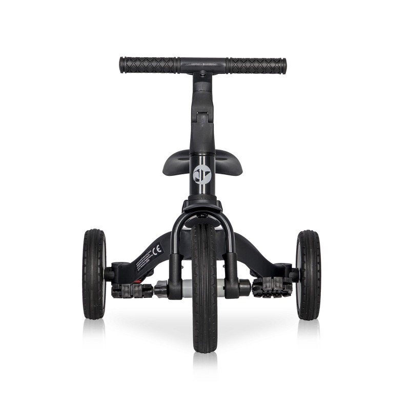 Dla dzieci w wieku od 3 do 4 lat. Dzięki innowacyjnemu opatentowanemu systemowi, wciskając zaledwie 3 przyciski i nie demontując żadnych elementów, przekształcisz rowerek trójkołowy w praktyczny edukacyjny rowerek biegowy. Wystarczy połączyć tylne koła w jedno stabilne podwójne koła i zdemontować pedały.