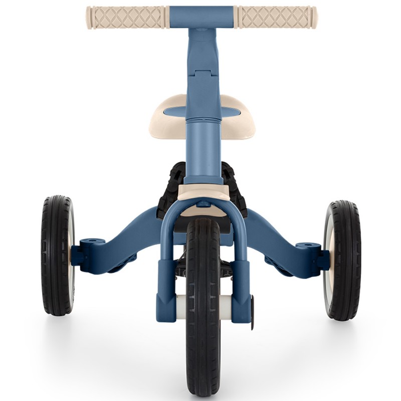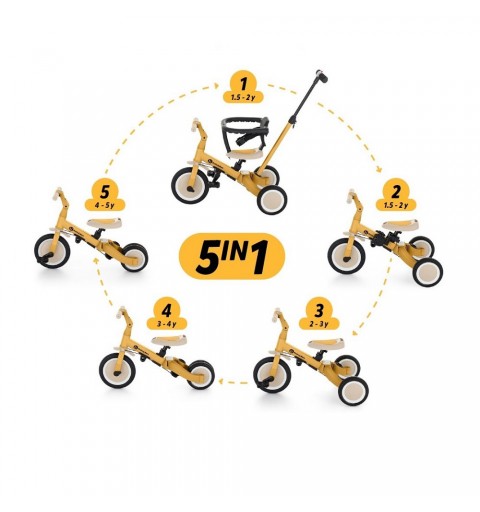 Wielofunkcyjny rowerek trójkołowy przeznaczony dla dzieci od 1,5 do 5 roku życia lub do 25 kilogramów. To nie tylko pojazd, służący do przemieszczania się i do nauki balansowania, ale także towarzysz rosnącego dziecka podczas wielu etapów rozwoju. Przemyślana transformacja rowerka dopasowuje się do potrzeb malucha w miarę wzrostu jego zdolności motorycznych. Początkowo to rowerek trójkołowy z możliwością asystowania przez rodzica, natomiast końcowa wersja to standardowy rowerek z pedałami, bez żadnych dodatkowych wspierających elementów. Dzięki takim zmianom w produkcie można wspomóc dziecko w etapach nauki jazdy na dwóch kołach.
