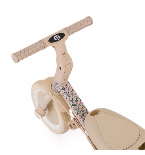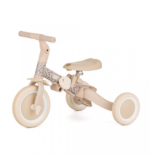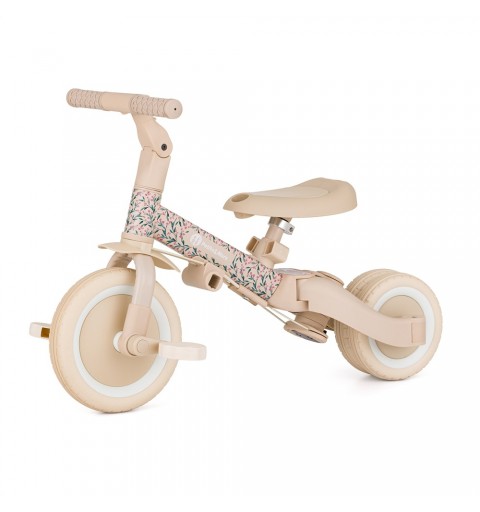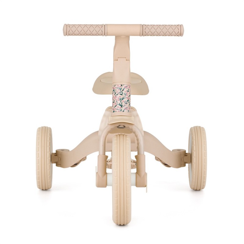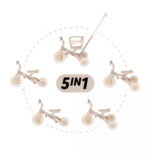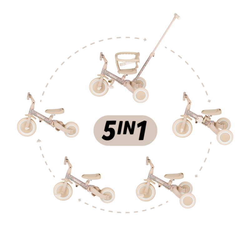 Wielofunkcyjny rowerek trójkołowy przeznaczony dla dzieci od 1,5 do 5 roku życia lub do 25 kilogramów. To nie tylko pojazd, służący do przemieszczania się i do nauki balansowania, ale także towarzysz rosnącego dziecka podczas wielu etapów rozwoju. Przemyślana transformacja rowerka dopasowuje się do potrzeb malucha w miarę wzrostu jego zdolności motorycznych. Początkowo to rowerek trójkołowy z możliwością asystowania przez rodzica, natomiast końcowa wersja to standardowy rowerek z pedałami, bez żadnych dodatkowych wspierających elementów. Dzięki takim zmianom w produkcie można wspomóc dziecko w etapach nauki jazdy na dwóch kołach.
