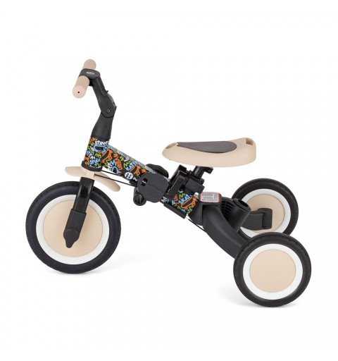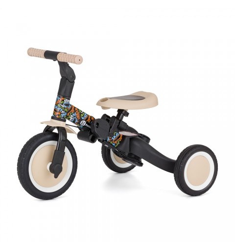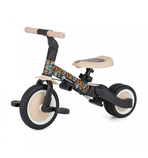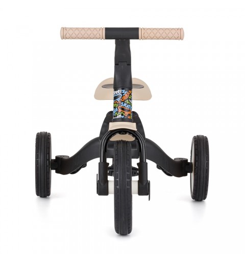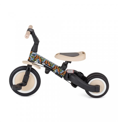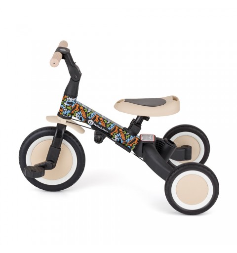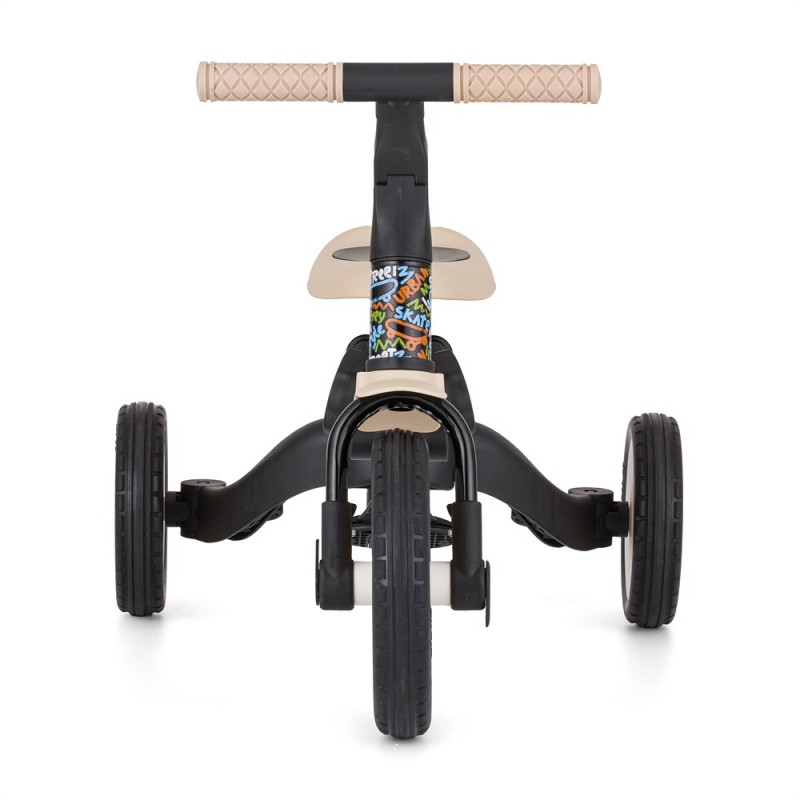 Wielofunkcyjny rowerek trójkołowy przeznaczony dla dzieci od 1,5 do 5 roku życia lub do 25 kilogramów. To nie tylko pojazd, służący do przemieszczania się i do nauki balansowania, ale także towarzysz rosnącego dziecka podczas wielu etapów rozwoju. Przemyślana transformacja rowerka dopasowuje się do potrzeb malucha w miarę wzrostu jego zdolności motorycznych. Początkowo to rowerek trójkołowy z możliwością asystowania przez rodzica, natomiast końcowa wersja to standardowy rowerek z pedałami, bez żadnych dodatkowych wspierających elementów. Dzięki takim zmianom w produkcie można wspomóc dziecko w etapach nauki jazdy na dwóch kołach.