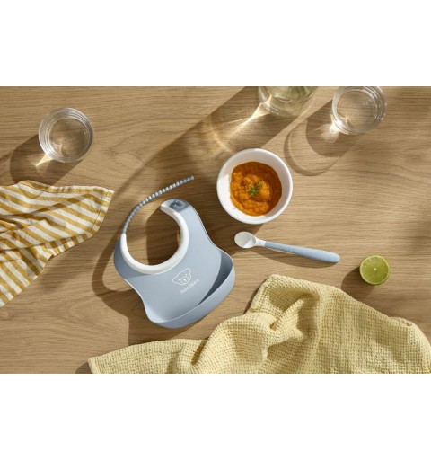 Solidna miseczka dla niemowląt, którą można łatwo trzymać podczas karmienia. Łyżka do karmienia z praktyczną długą rączką. Mały śliniaczek z wyjątkowo miękkim dekoltem.