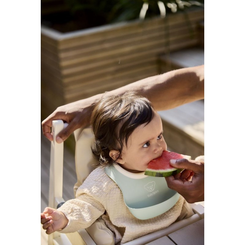 Solidna miseczka dla niemowląt, którą można łatwo trzymać podczas karmienia. Łyżka do karmienia z praktyczną długą rączką. Mały śliniaczek z wyjątkowo miękkim dekoltem.
