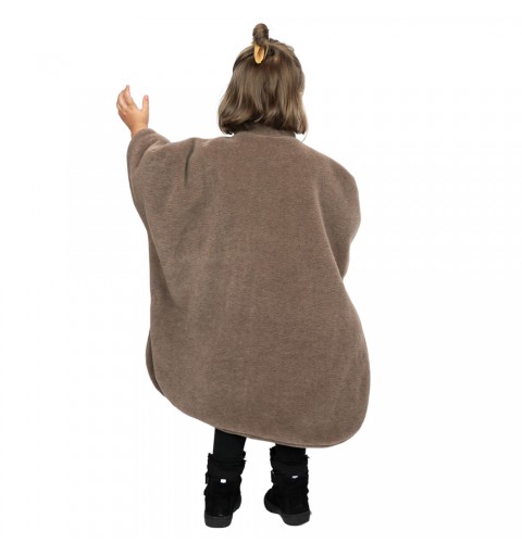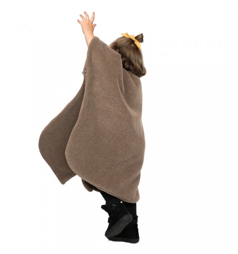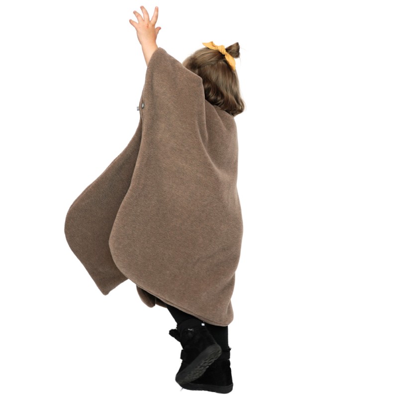 Ponczo do fotelika w jednym, uniwersalnym rozmiarze, dedykowane dzieciom w wieku od 2 do 6 lat, długość zamka z przodu to 50 cm, długość całkowita poncza to około 60 cm, a rozpiętość ramion około 80 cm, więc może posłużyć bardzo długo. Aby przedłużyć życie poncza, możesz dokupić mitenki, czyli ocieplacze na rączki do kompletu. Prać w pralce, w temperaturze 30 stopni, zamek podczas prania powinien być zasunięty. Ponczo uszyte jest z dwóch warstw ciepłego, mięsistego polaru (100% poliester) o gramaturze 300g każda, posiadającego Certyfikat Oeko Tex Standard 100.