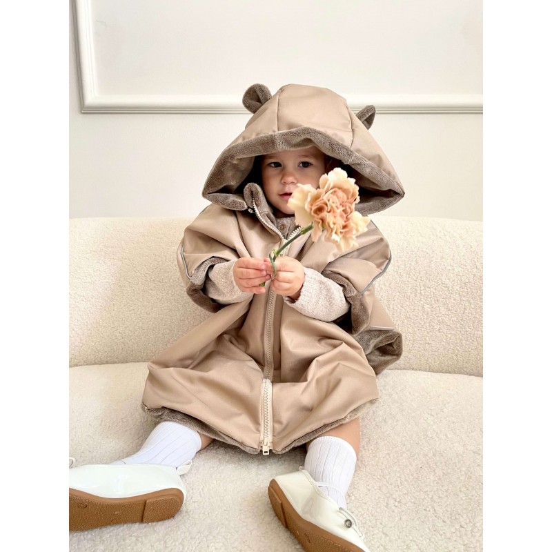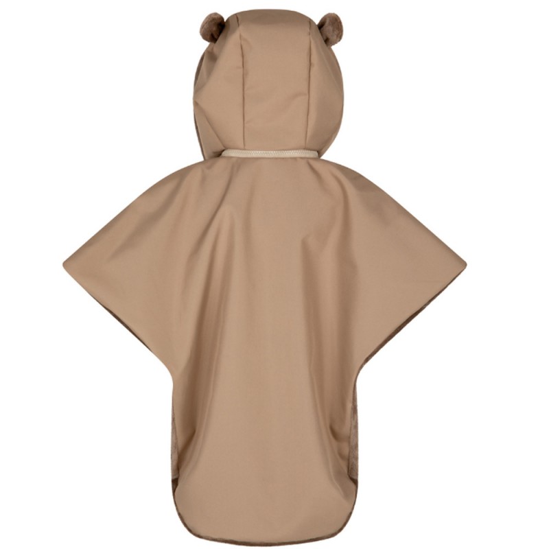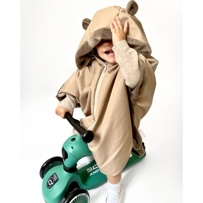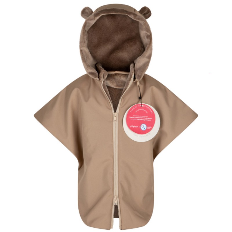 - Wodoodporna zewnętrzna warstwa, która chroni dziecko przed deszczem, śniegiem, wiatrem. Środek poncza wykonany z miękkiego i ciepłego futerka.