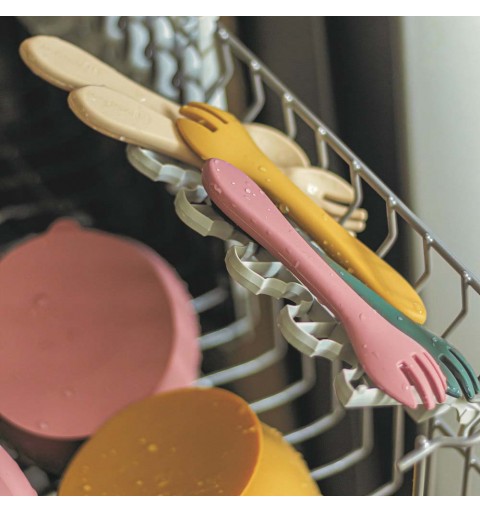 Zestaw składający się z widelca oraz łyżeczki został wykonany w całości z silikonu spożywczego bez BPA. Dzięki temu dziecko może jeść za pomocą sztućców pokarmy zarówno ciepłe, jak i zimne. Elastyczny silikon sprawia, że sztućce doskonale nadają się do wrażliwych dziąseł małego dziecka. Przeznaczone są dla małych dzieci od 6 miesiąca życia, którym wprowadza się rozszerzoną dietę oraz takich które z powodzeniem uczą się już samodzielnego jedzenia. Zaokrąglone kształty i niewielkie rozmiary ułatwiają małemu dziecku nabieranie i spożywanie pokarmu.