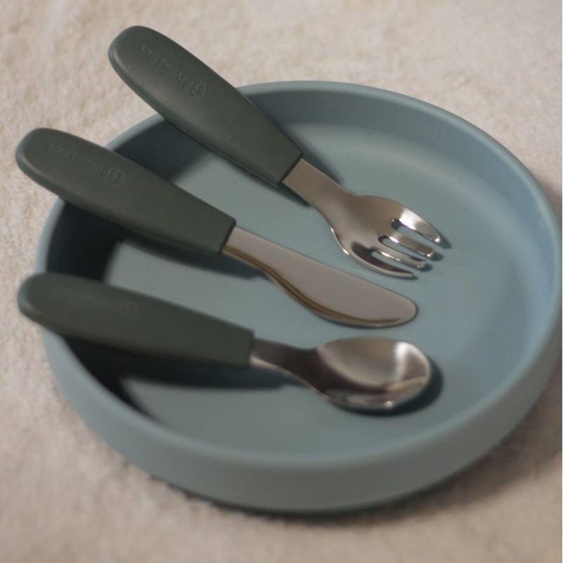 Części robocze wykonane zostały z wysokiej jakości stali nierdzewnej, a ergonomiczne uchwyty pokryte miękkim, bezpiecznym silikonem są dostosowane do małych rączek dziecka. Dzięki temu maluch może wygodnie i pewnie trzymać sztućce, ucząc się przy tym prawidłowych nawyków przy stole.