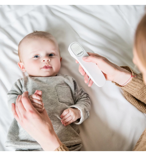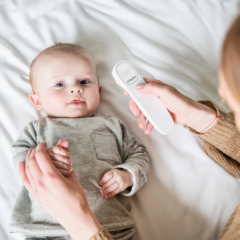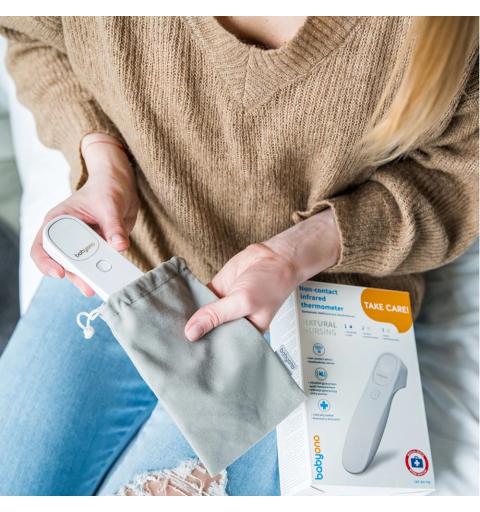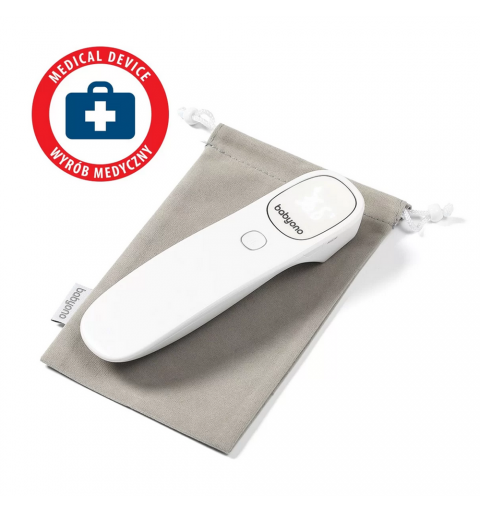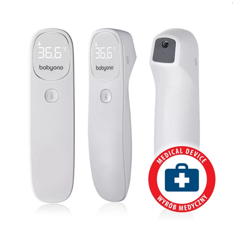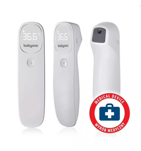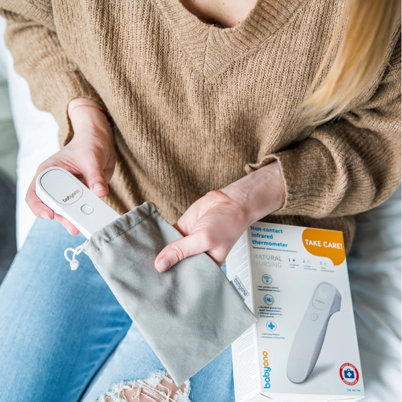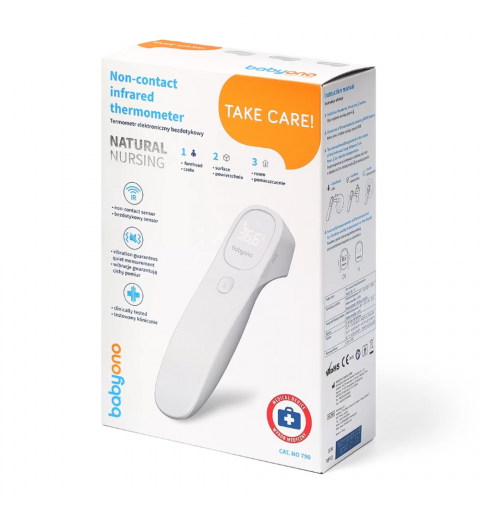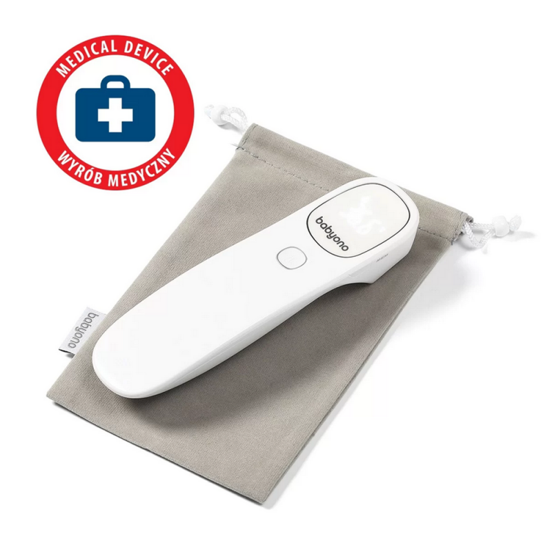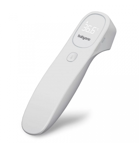 Termometr bezdotykowy Babyono szybko i dokładnie mierzy temperaturę. Po naciśnięciu jednego przycisku można uzyskać dokładny odczyt już po 1 sekundzie. Jest łatwiejszy i wygodniejszy w użyciu niż tradycyjne termometry doustne, pod ramię lub douszne. Termometr mierzy również temperaturę przedmiotów, pokarmów, cieczy i otoczenia. Cichy i unikalny alarm wibracyjny umożliwia pomiar temperatury w czasie snu dziecka. Stylowy i podświetlany ekran LED pozwala łatwo odczytać temperaturę nawet w nocy. Jest to wyrób medyczny testowany klinicznie w UE.
