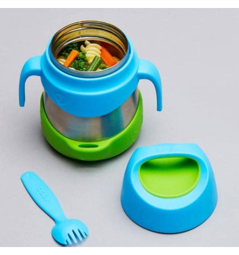 do termosu dołączono bezpieczny widelczyk, który mocowany jest do silikonowej podstawy (kompaktowy zestaw, który łatwo zabrać ze sobą tam, gdzie będzie potrzebny);
