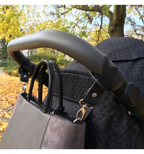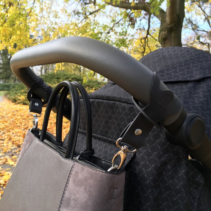 Praktyczne uchwyty do mocowania torby dla mam do wózka. Końcówkę z karabińczykiem łatwo przeciągniesz przez oczko wokół rękojeści wózka.