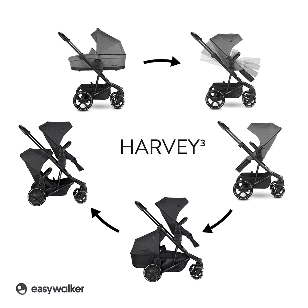 Harvey³ oferuje dużo możliwości podróżowania: z gondolą, z fotelikiem samochodowym, z siedziskiem skierowanym do rodzica lub do kierunku jazdy, a także w wersji podwójnej z dwoma siedziskami, fotelikami, czy z siedziskiem i gondolą, bo model ten rozwija się wraz z Twoją rodziną. Jeśli spodziewasz się bliźniaków lub kolejnego dziecka, wystarczy że powiększysz go, dzięki prostej w montażu, dodatkowej osi (do kupienia osobno), a stanie się wózkiem dla dwojga.