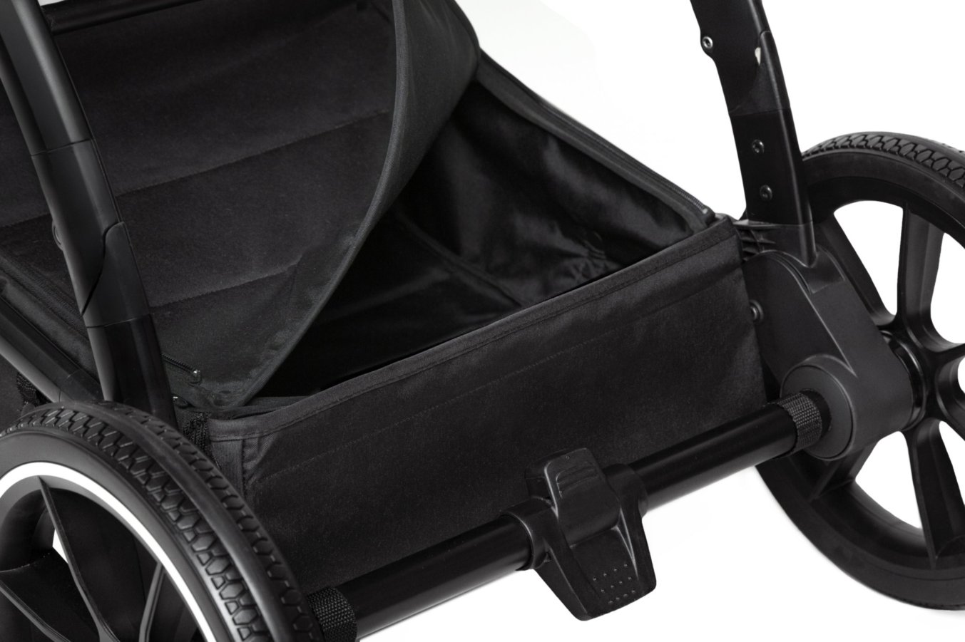 Duży kosz mocowany na konstrukcji wózka pozwala na przewożenie najbardziej potrzebnych rzeczy przydatnych przy dziecku na co dzień.